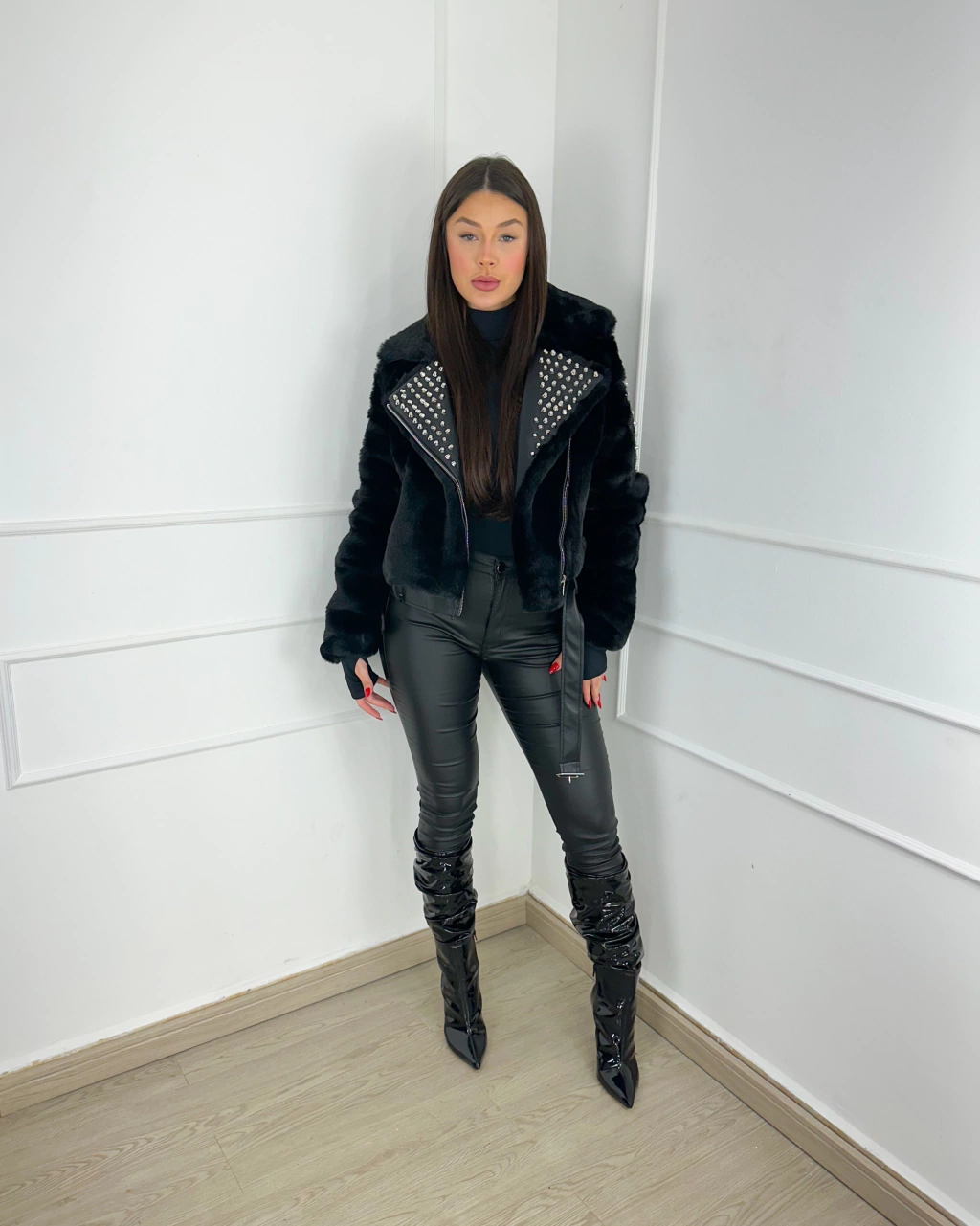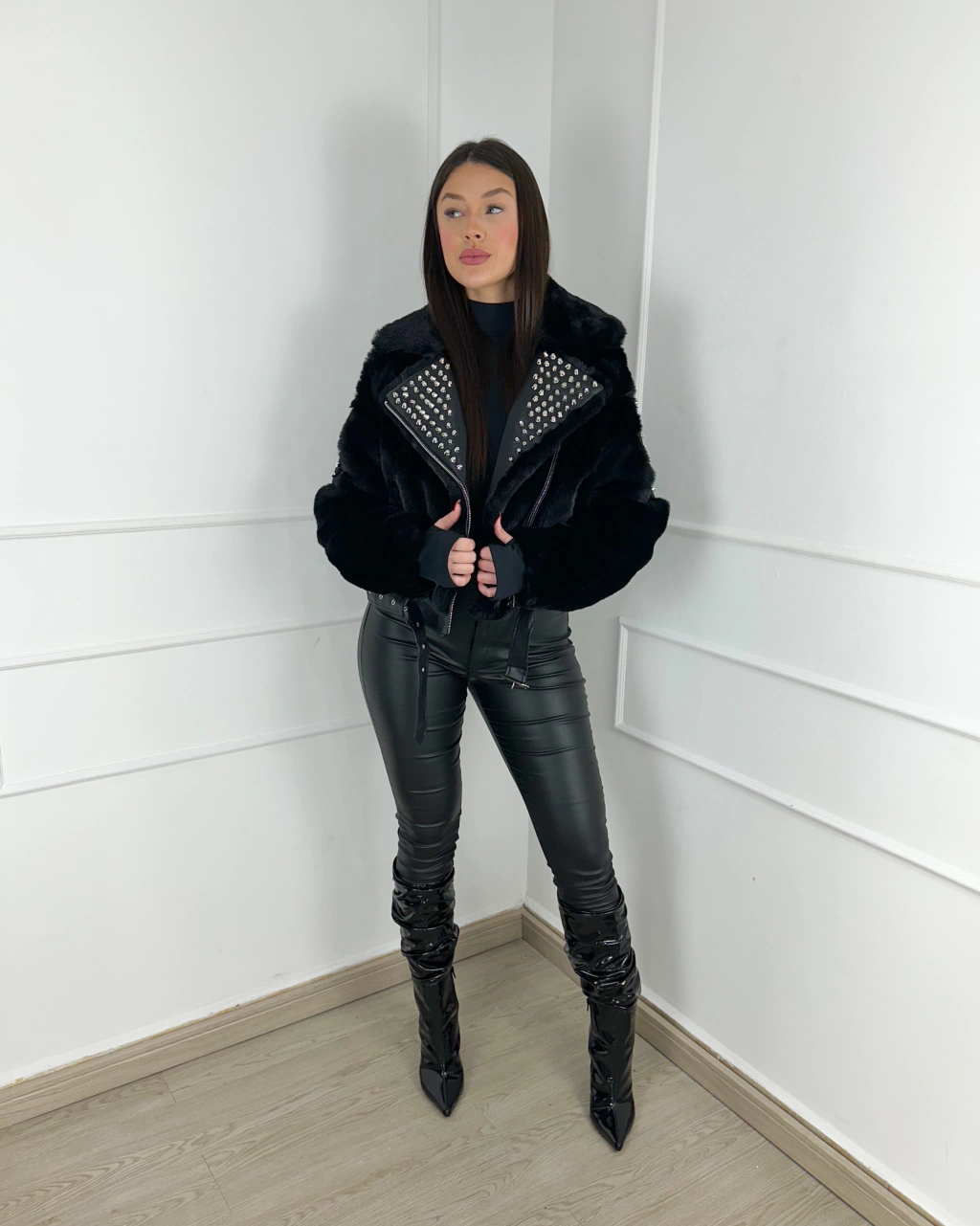 Um monumento em forato de jaqueta, toda no couro com pelinhos e aplicações em spikes, um luxo e puro estilo. Conta com forro, ziper transversal e cinto. Perfeita para os dias mais frios, uma viagem para as montanhas.